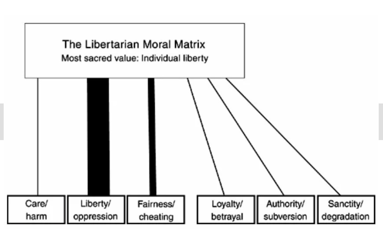 Here’s the punch line: liberals tend to rely heavily on two, maybe three of these foundations—Care, Liberty, and Fairness. Libertarians value (you guessed it) Liberty above all. Conservatives draw on all six foundations, roughly equally. This is Haidt’s famous “conservative advantage.”
