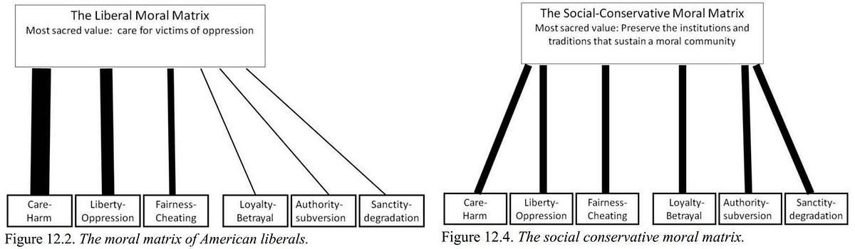 Plenty of liberals would push back here—and fairly. It’s not that liberals are blind to loyalty or authority or sanctity. They experience those instincts too. But Haidt’s data suggests they weight them far less heavily.